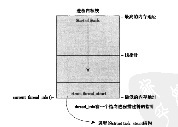 在进程的内核栈的底部,有一个数据结构(struct thread_info)。该数据结构里面的字段存储着进程的一些信息。